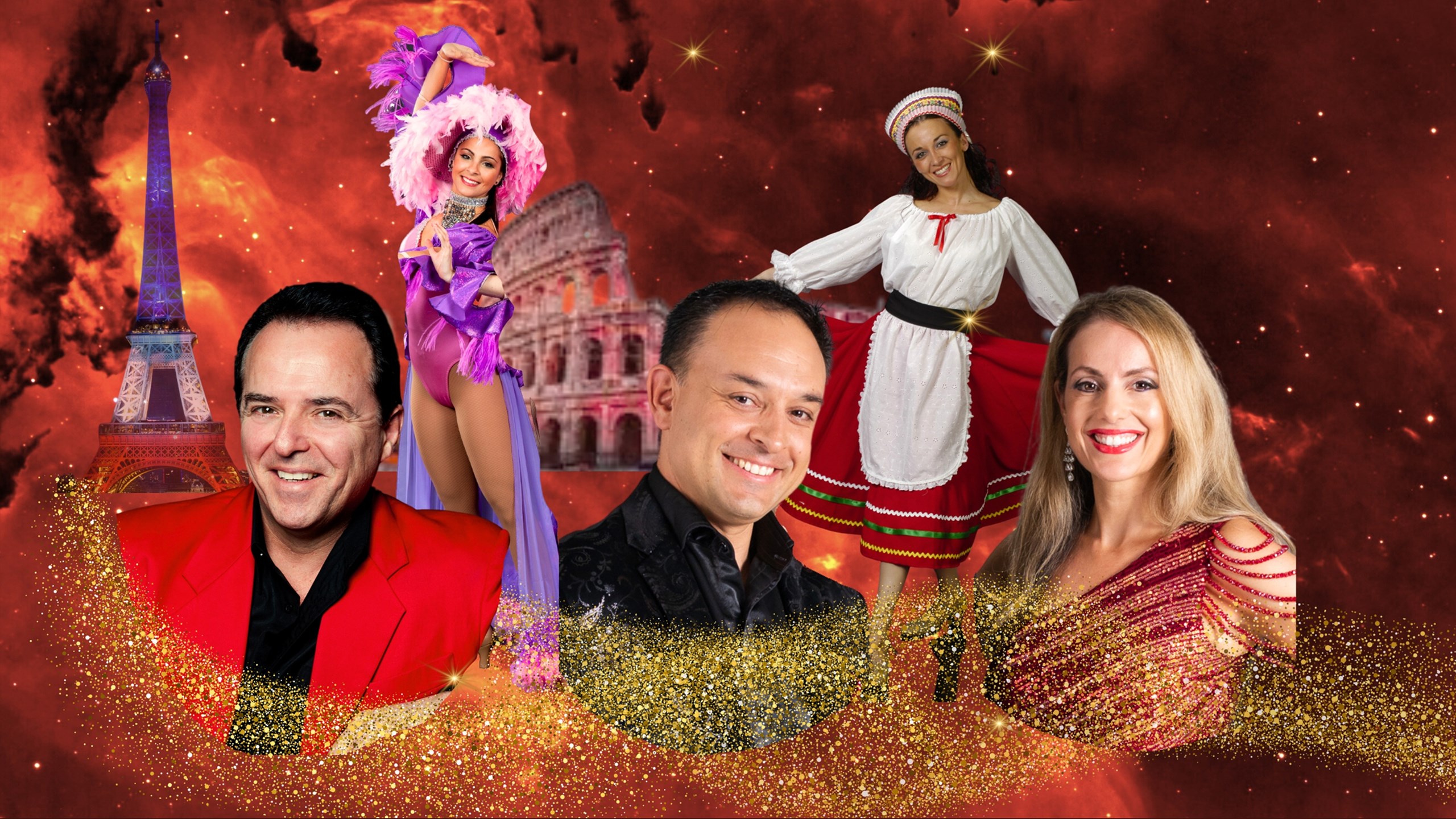 Onto France with a lavish medley of favourite French songs presented in Moulin Rouge and Follies Bergere revue style. Finally to the magic and mystery of Spain’s traditional music through to the modern day hits of the Gipsy Kings.