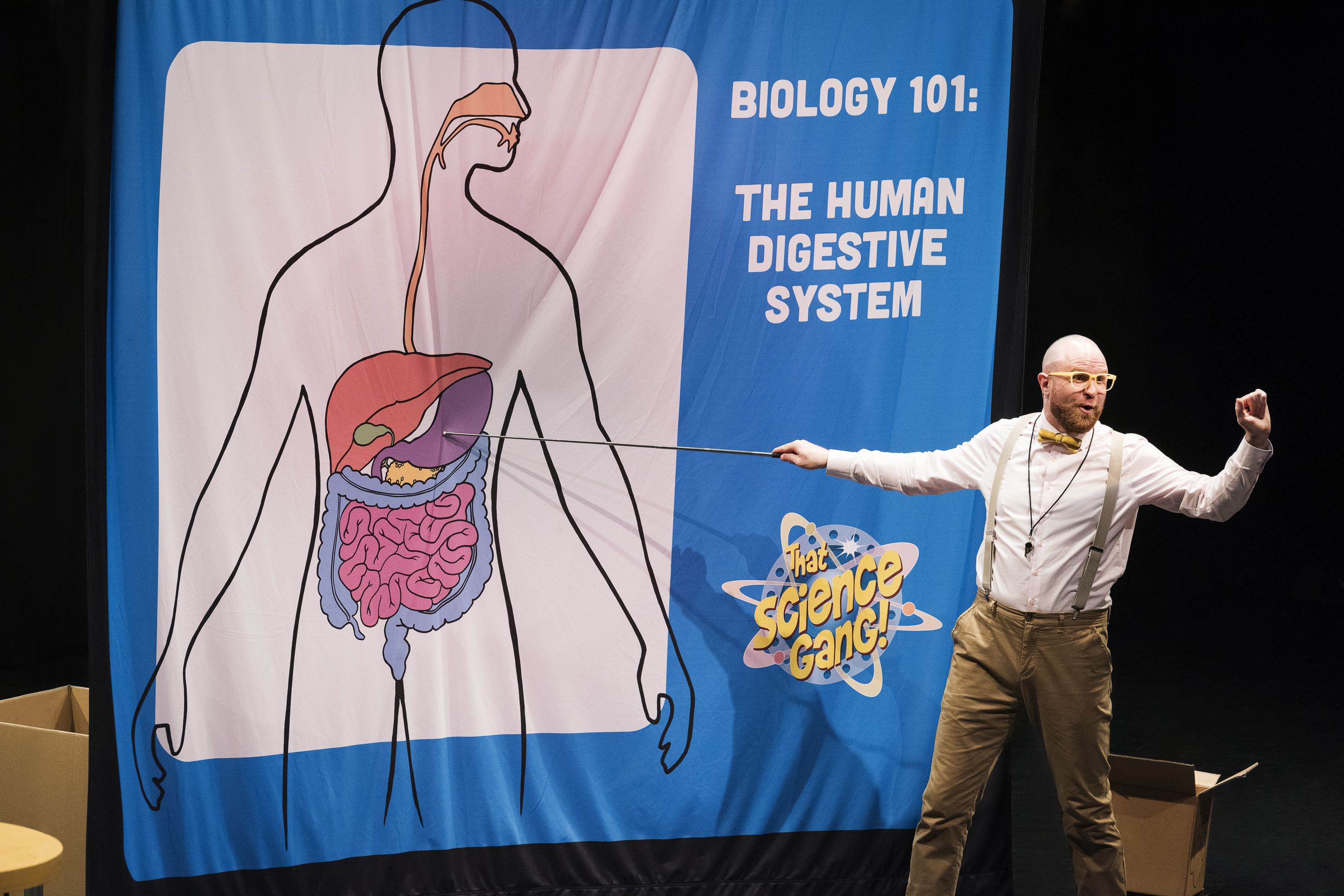 Join biology teachers Oesoph A. Gus and Dewey Dean as they embark upon an utterly brilliant all singing, all-dancing (and all-clowning), exploration of every twisting tube and remarkable organ with sketches, songs and sensational science.