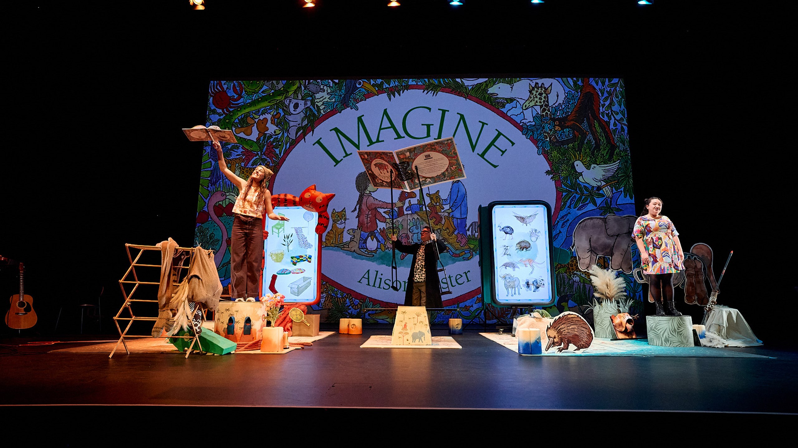Magical and meaningful, IMAGINE LIVE is a celebration of creativity, friendship and our precious natural world. With the help of the audience, performers play and sing their way through the pages of Alison Lester’s iconic best-selling book, and quickly discover there is WAY more to these pages than they first thought.
