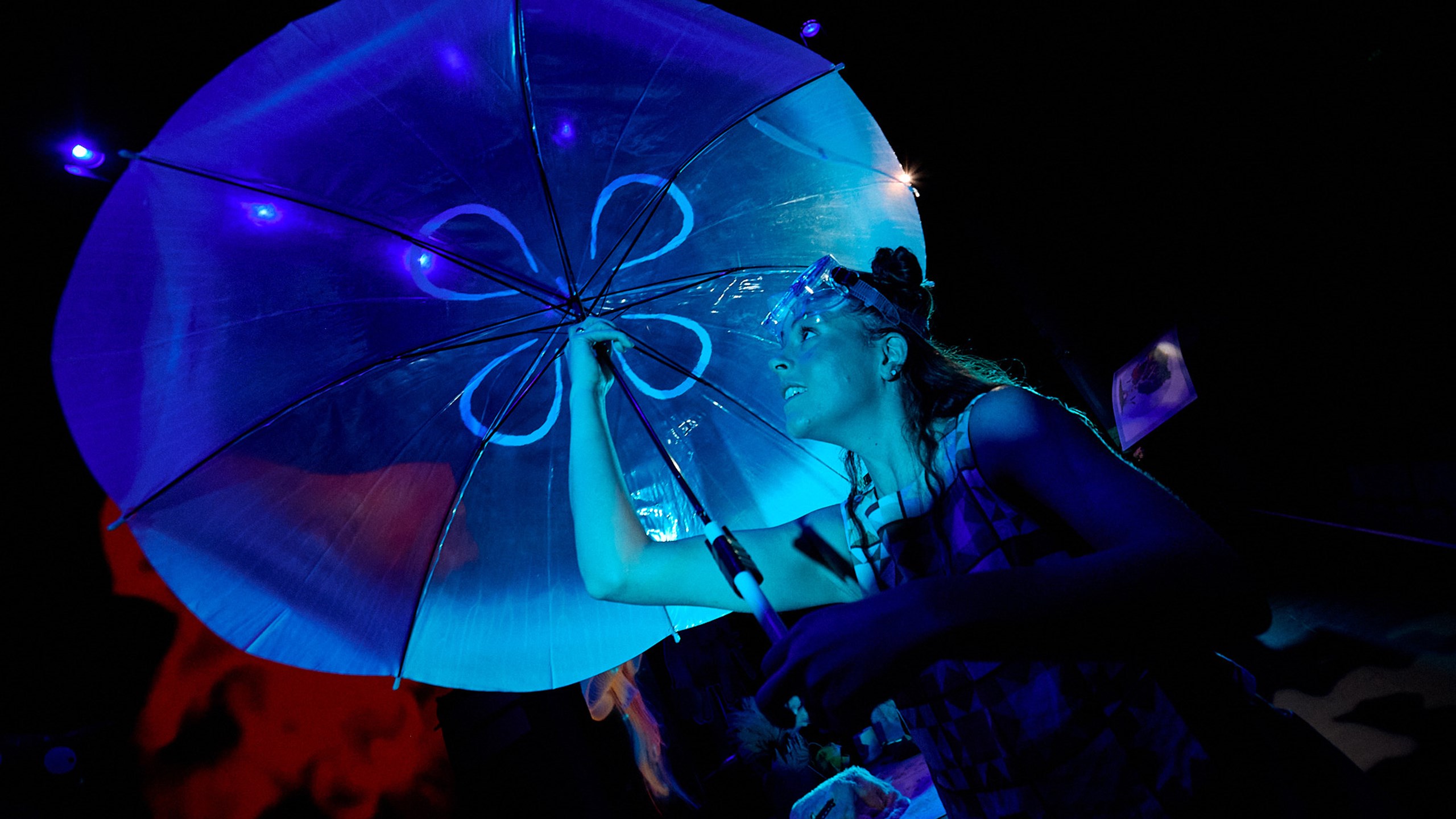 IMAGINE LIVE combines live action and animation with digital puppetry in a large-scale, multi-screen performance. Underscored by original music, characters and objects travel between real and animated worlds, responding in real time to audience input.