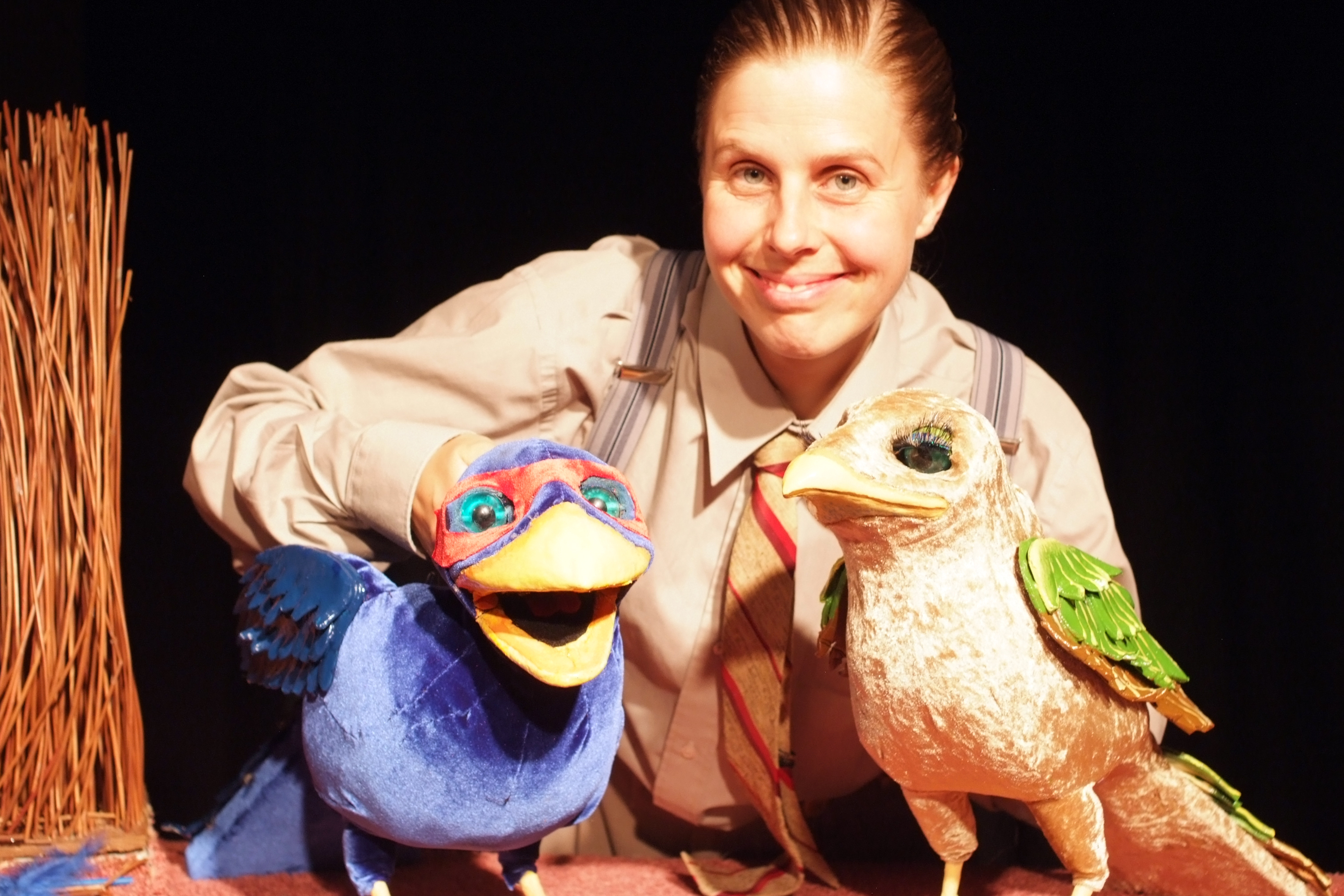Jenny Ellis, a puppeteer of more than twenty years, weaves the whole mystery together, sometimes playing three characters at once. The young audience will gasp with surprise, sigh with the sadness, shout in outrage, cheer with triumph, and dance with joy as they follow the sneaky bowerbird on his journey to find love.